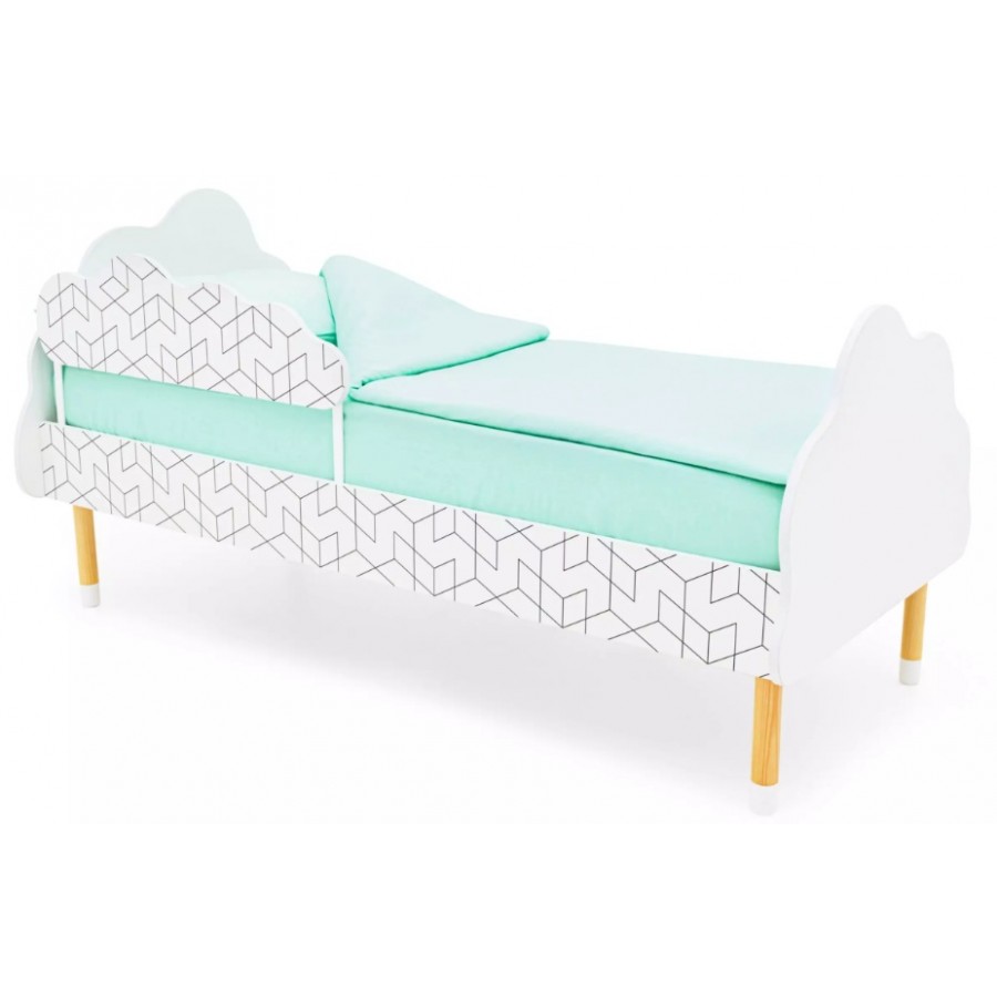 Изголовье и изножье кроватки сделаны в виде облака. Высота от пола до самого высокого места составляет 66 см. Это позволяет даже маленькому ребенку комфортно забираться и спускаться с нее, не рискуя упасть. Специальная конструкция кровати позволяет с лёгкостью присесть или прилечь рядом взрослому, если ребенок не может заснуть.