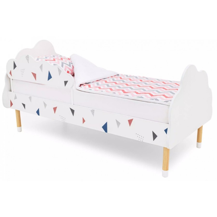 Изголовье и изножье кроватки сделаны в виде облака. Высота от пола до самого высокого места составляет 66 см. Это позволяет даже маленькому ребенку комфортно забираться и спускаться с нее, не рискуя упасть. Специальная конструкция кровати позволяет с лёгкостью присесть или прилечь рядом взрослому, если ребенок не может заснуть.