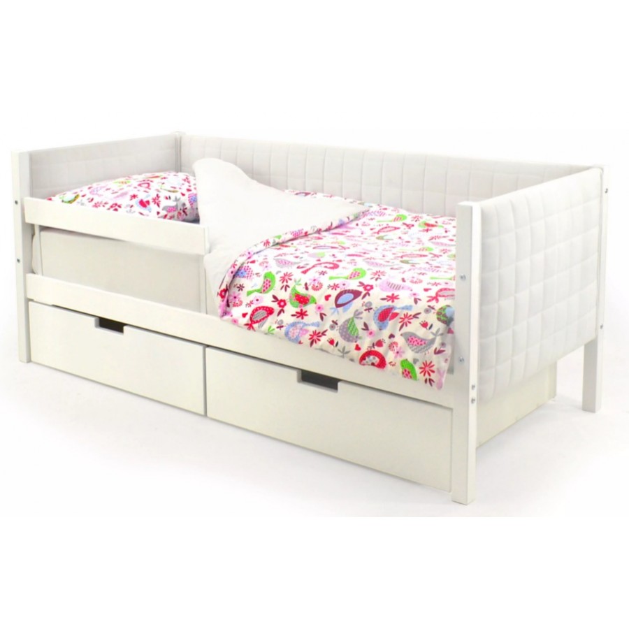 Комплект кровати состоит из каркаса кровати, мягких чехлов на бортики и ортопедического основания. Дополнительный бортик, ящики, матрас и постельные принадлежности приобретаются отдельно.